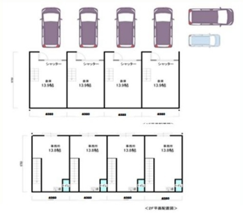 | 備考 | 03号室募集、坪単価約12300円、1階18.93㎡ 2階22.47㎡、電気、水道、エアコン、トイレウォシュレット、リモコン式電動シャッター、現状渡し。 |