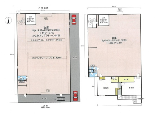 2階建貸倉庫工場 延べ約246.41坪 ◇2t・2.8tのクレーン2基有り ◇200kgのリフト有り ◇天井高5m ◇専用駐車スペース有り ◇工業専用地域
